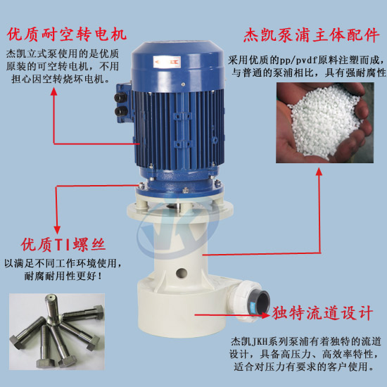 杰凱JKH 高壓耐酸堿立式泵 1-10HP使用范圍廣,適合各種酸堿液循環(huán)、冷卻、噴洗設(shè)備,廢氣塔、蝕刻機(jī)、化學(xué)鍍、無電解鎳等特殊場合;適合于槽內(nèi)安裝使用,可配合過濾機(jī)使用。