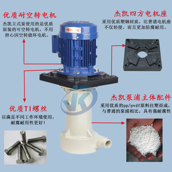 3、JKT 耐酸堿液下泵適合各種酸堿液循環(huán)、冷卻、噴洗設備,廢氣塔、蝕刻機、化學鍍、無電解鎳等特殊場合;